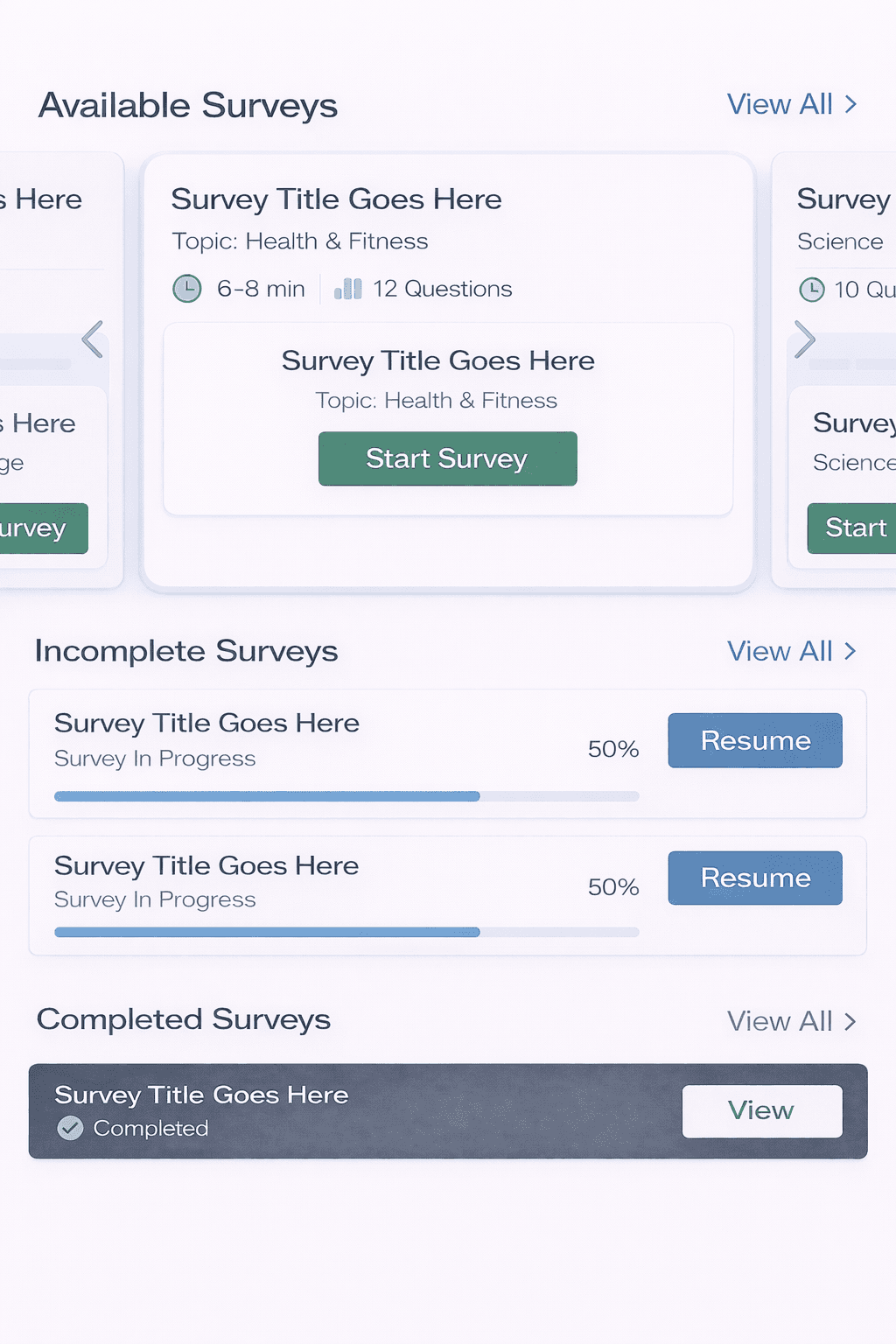 To reduce decision friction and encourage faster survey starts, I redesigned the Available Surveys section as a dedicated, mobile-friendly carousel that highlights only new and available surveys.